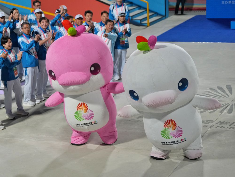 11月11日,吉祥物“喜洋洋”“樂融融”在惠州舉行第十五屆全國運動會滑板項目頒獎儀式前。新華社記者 劉坤 攝