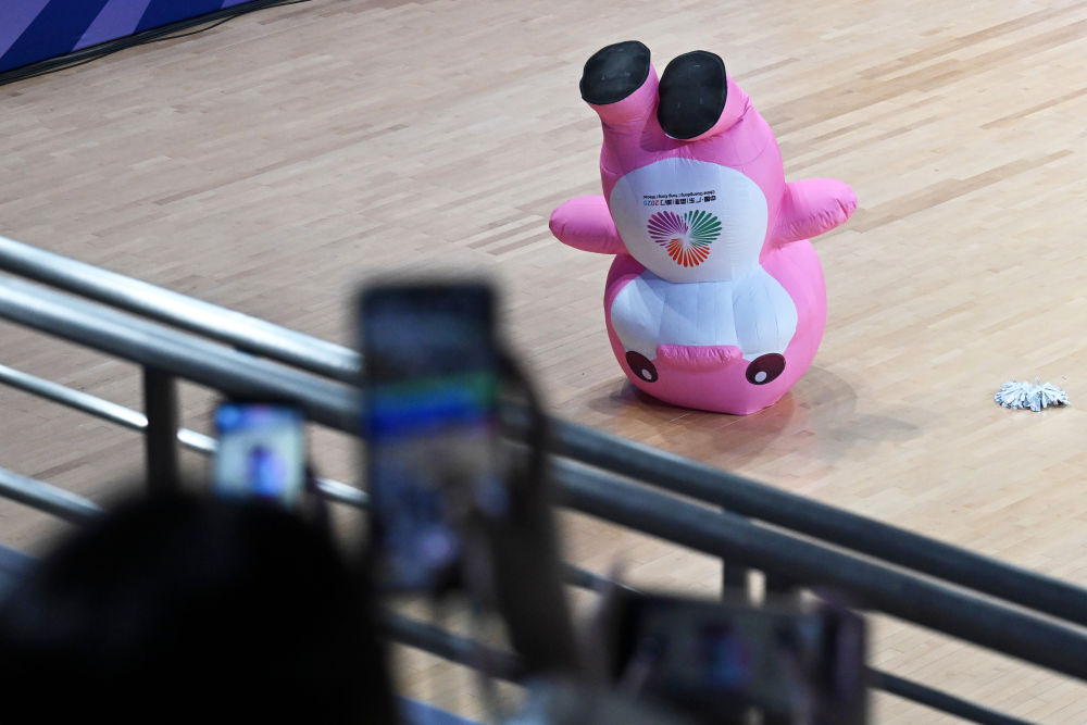 11月12日,在廣州舉行的第十五屆全國運動會排球男子18歲以下組A組小組賽中,全運會吉祥物“樂融融”在比賽間隙表演。新華社記者 黃偉 攝