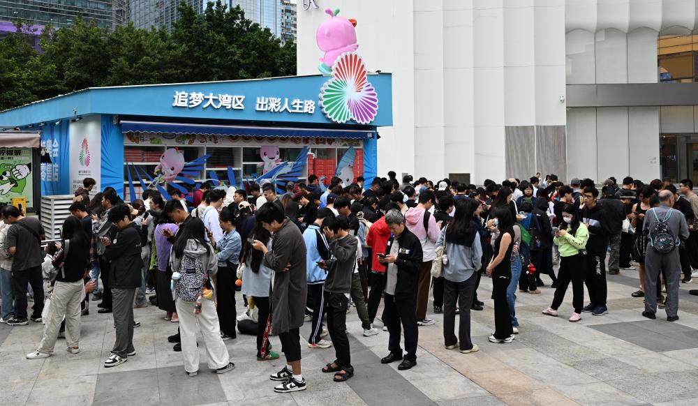 11月12日,市民在廣州市正佳廣場附近的一家全運會官方特許商品零售店外排隊等待進店選購紀念品。新華社記者 陳朔 攝