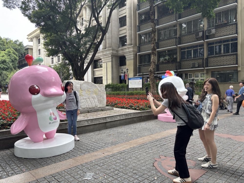 11月12日,游客在廣州街頭與吉祥物“樂融融”合影。新華社記者 程婷婷 攝