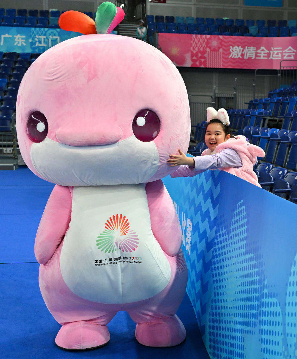 11月11日,在廣東江門進行的第十五屆全國運動會排球女子20歲以下組小組賽A組比賽中,一名小觀眾在賽后與吉祥物“樂融融”合影。新華社記者 李鑫 攝
