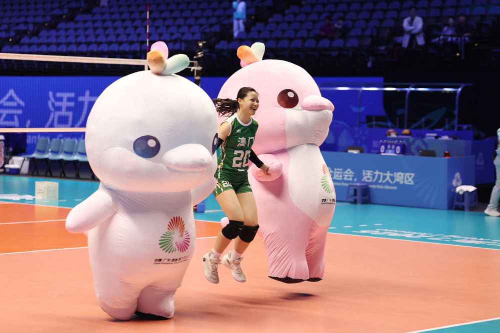 11月12日,在澳門進行的第十五屆全國運動會排球女子成年組小組賽A組比賽中,澳門隊球員秦昕賢在比賽后與吉祥物互動。新華社記者 陳斌 攝