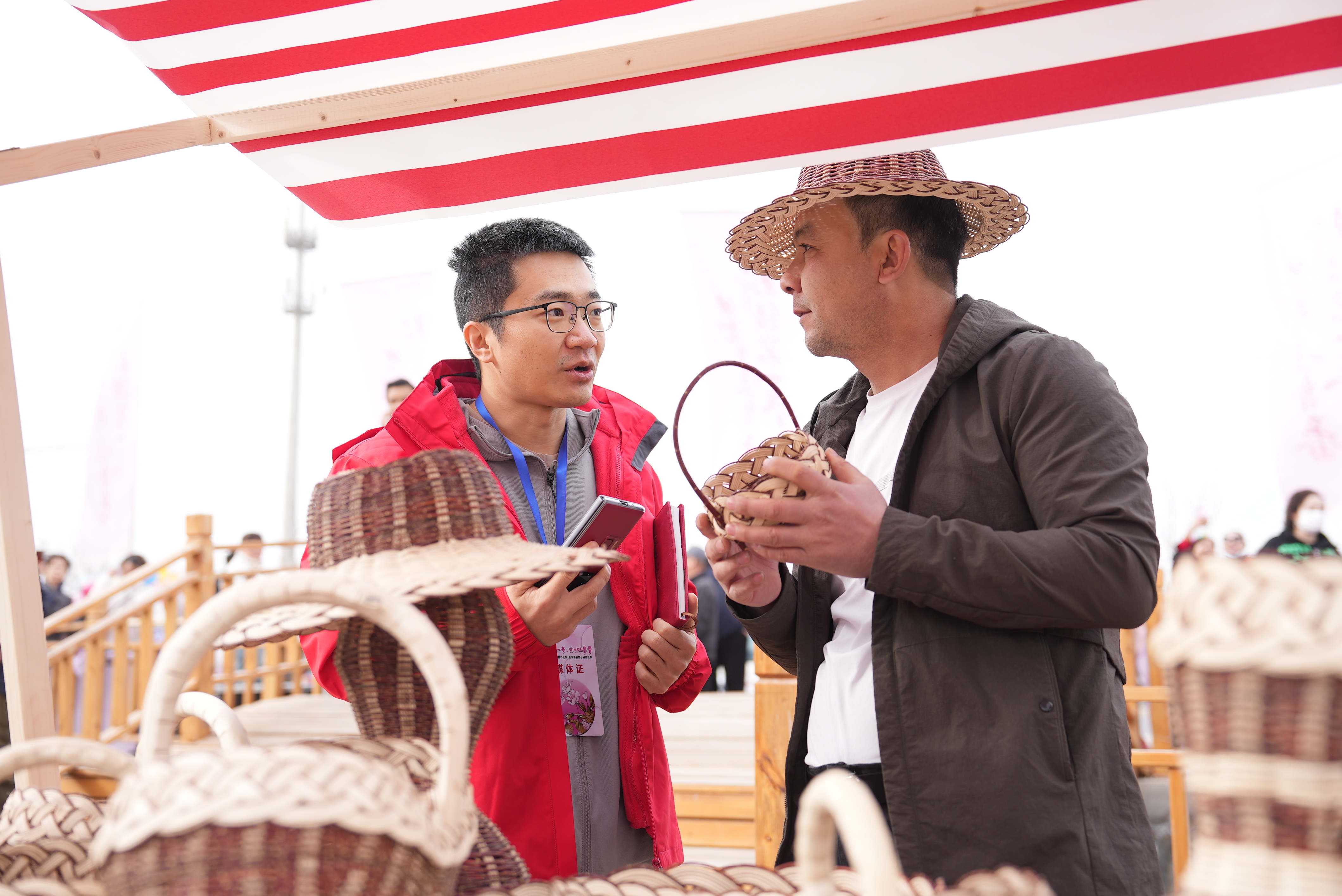 在模戳印花布攤位,游客拿起木模,用力在土布上印出自己喜歡的圖案;在柳編制品攤位,非遺傳承人熱情地向游客介紹著自己的得意作品;在土陶制品攤位,陶碗、陶杯等制品造型古樸、渾然天成,吸引了眾多游客詢(xún)價(jià)購(gòu)買(mǎi)。