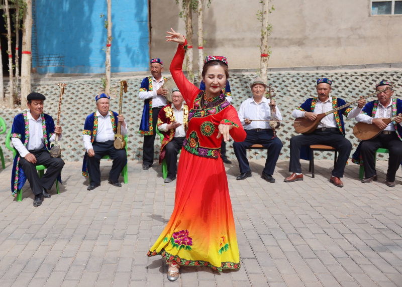 4月28日,在鄯善縣連木沁鎮阿斯坦村河畔美食廣場,村民正在表演舞蹈。王立三攝