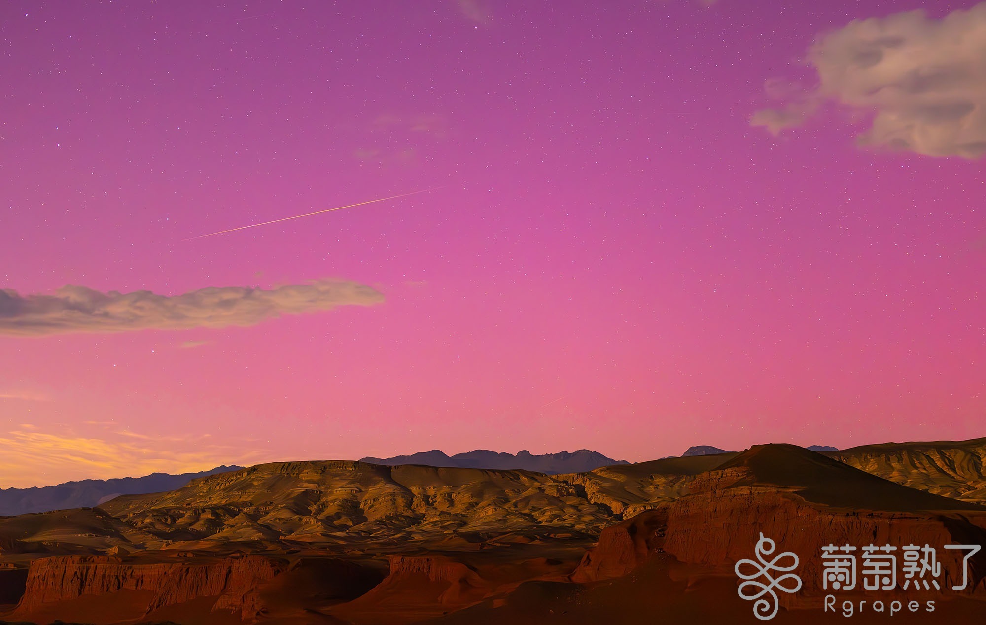 葡萄熟了/吐魯番市融媒體中心訊(文/圖 通訊員 李靖海 胡國凱 黃黎)8月12日22時30分左右,托克遜縣天山紅河谷景區(以下簡稱紅河谷)上空出現了一道罕見的極光,這一自然奇觀被當晚正在該地拍攝英仙座流星雨的攝影師意外記錄了下來。