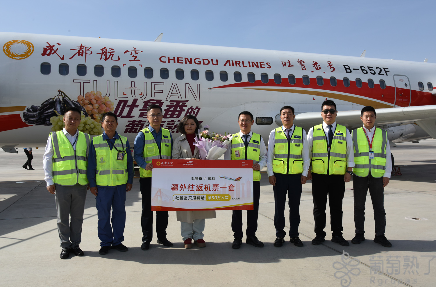 吐魯番機場為第50萬名旅客送上鮮花和機票等獎品。葡萄熟了/吐魯番市融媒體中心記者 劉健 攝