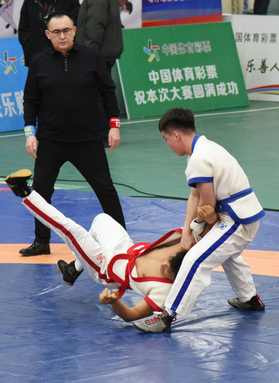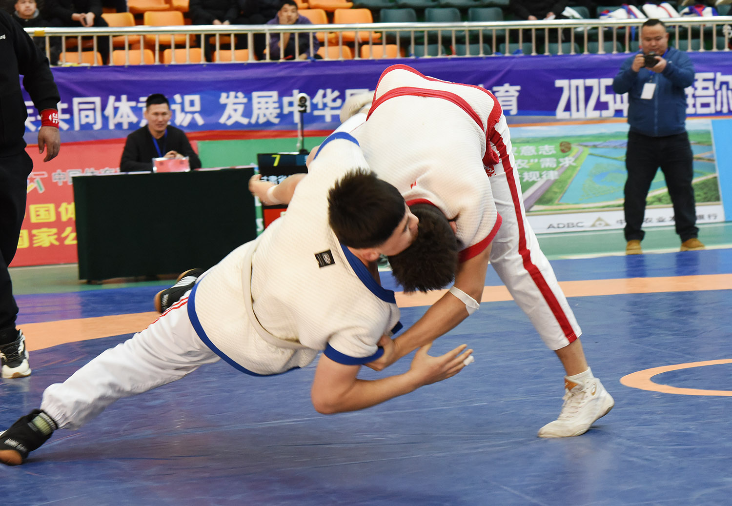 2月12日,2025年新疆維吾爾自治區(qū)首屆“石榴籽杯”中國(guó)式摔跤推廣賽暨第十五屆全國(guó)運(yùn)動(dòng)會(huì)群眾項(xiàng)目選拔賽在高昌區(qū)體育館開(kāi)賽。圖為選手對(duì)決瞬間。吐魯番市融媒體中心記者 劉健 攝
