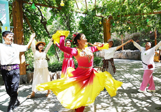7月5日,游客在葡萄溝景區(qū)與演員互動。吐魯番市融媒體中心記者 劉健 攝