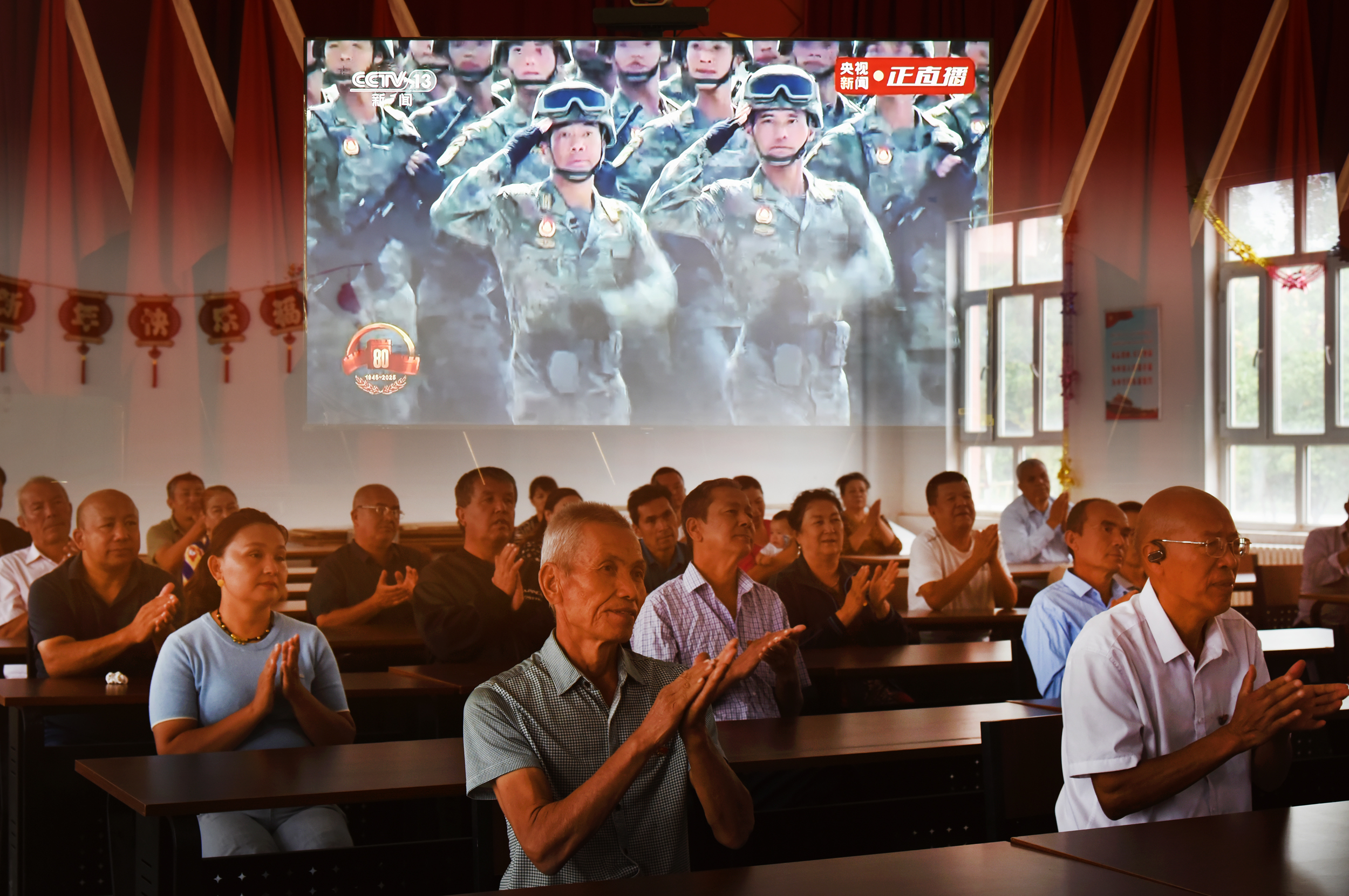 9月3日,紀念中國人民抗日戰爭暨世界反法西斯戰爭勝利80周年大會在北京隆重舉行。這是高昌區葡萄鎮布拉克村干部群眾觀看電視直播。吐魯番市融媒體中心記者 劉健 攝