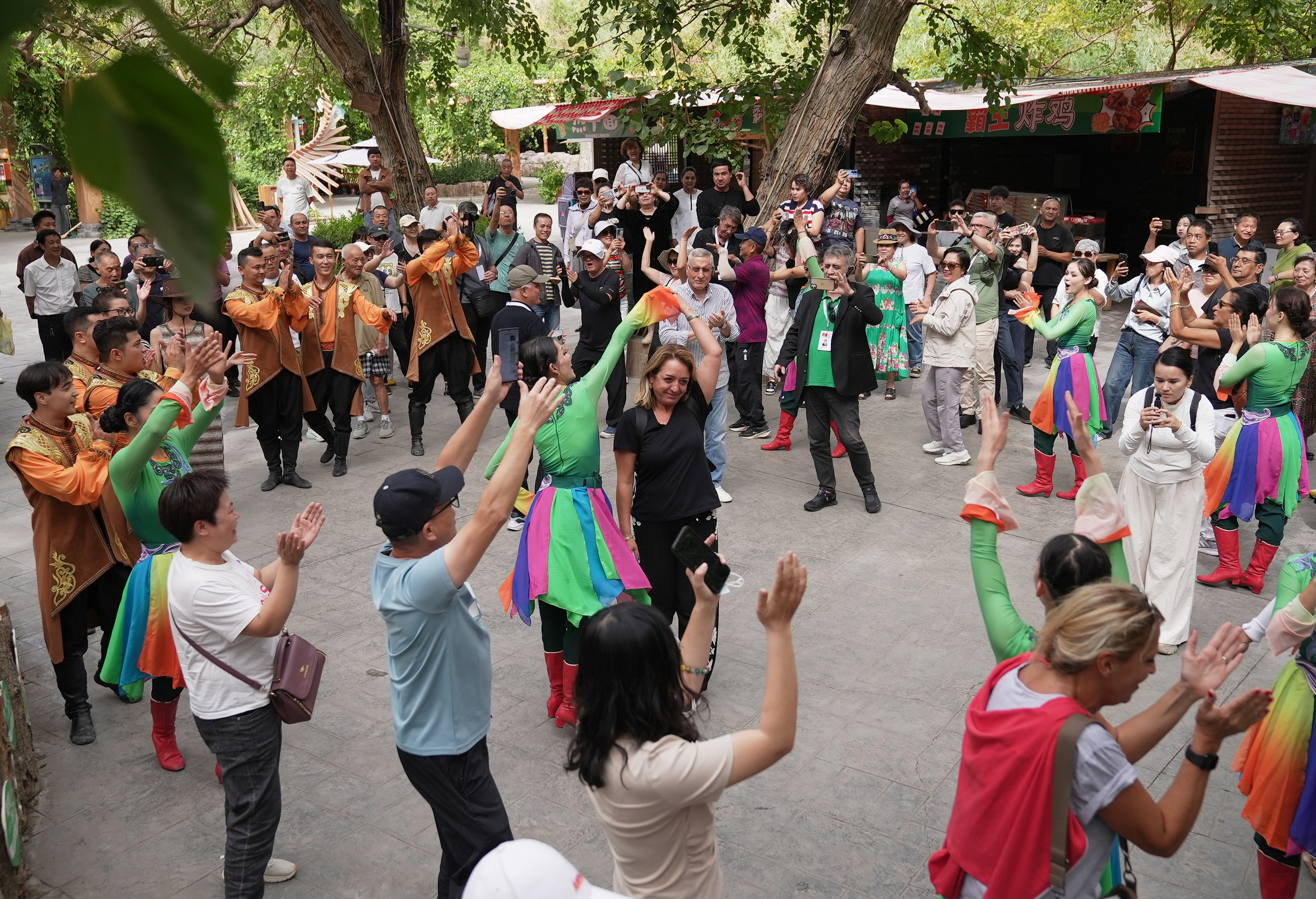代表團(tuán)成員與民間藝人共舞。吐魯番市融媒體中心記者 劉字昂 攝