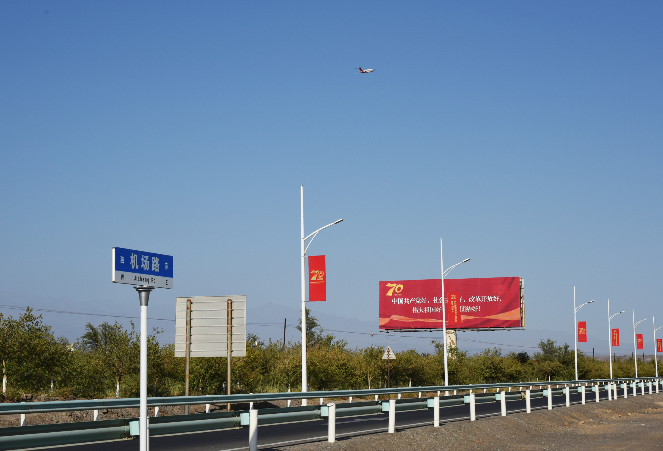 ?9月16日,吐魯番機場路旁的燈桿上懸掛著印有新疆維吾爾自治區成立70周年的慶祝標語。?吐魯番市融媒體中心記者 劉健 攝