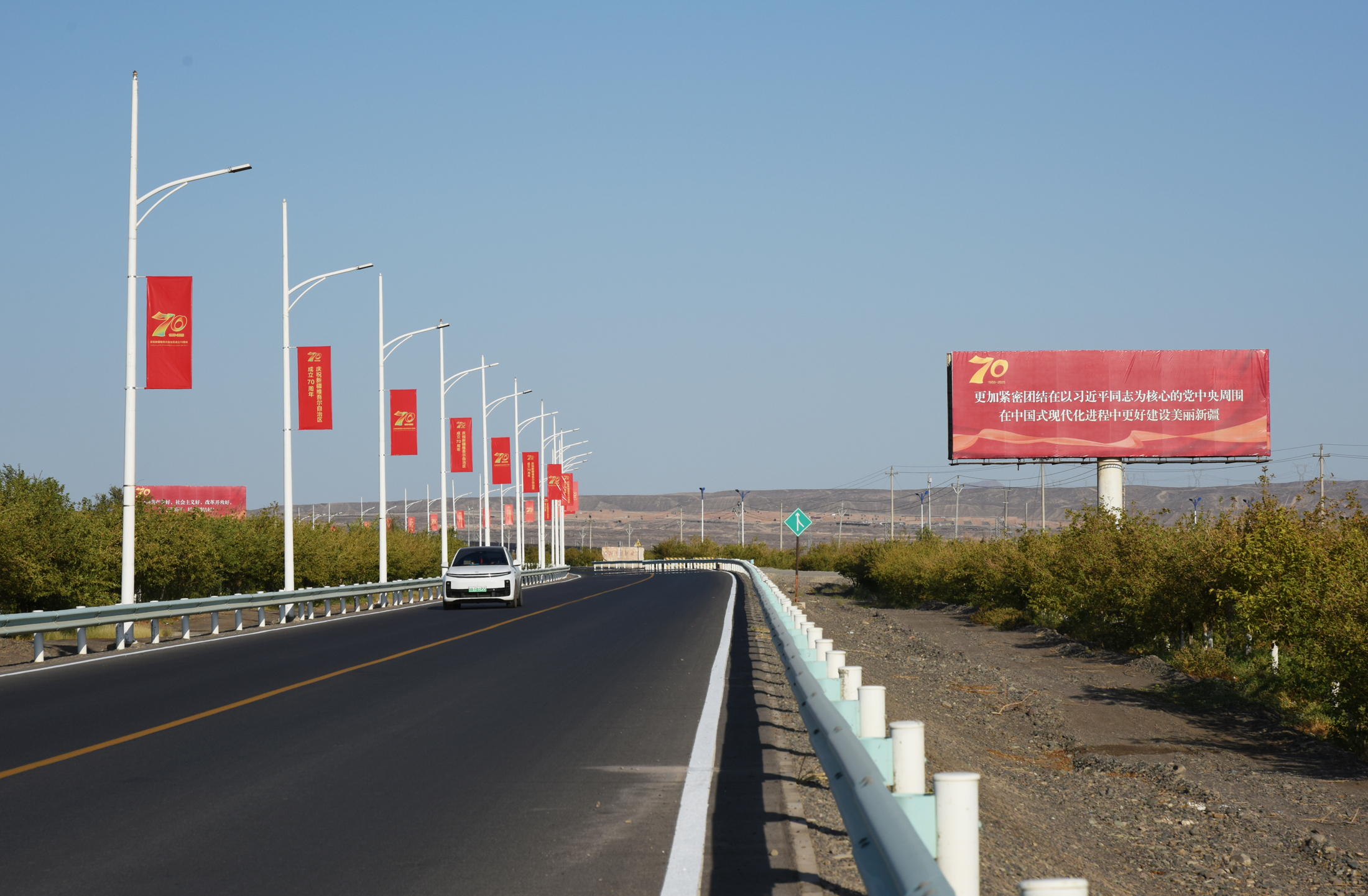 9月16日,312國道吐魯番段懸掛的印有新疆維吾爾自治區成立70周年的慶祝標語。吐魯番市融媒體中心記者 劉健 攝