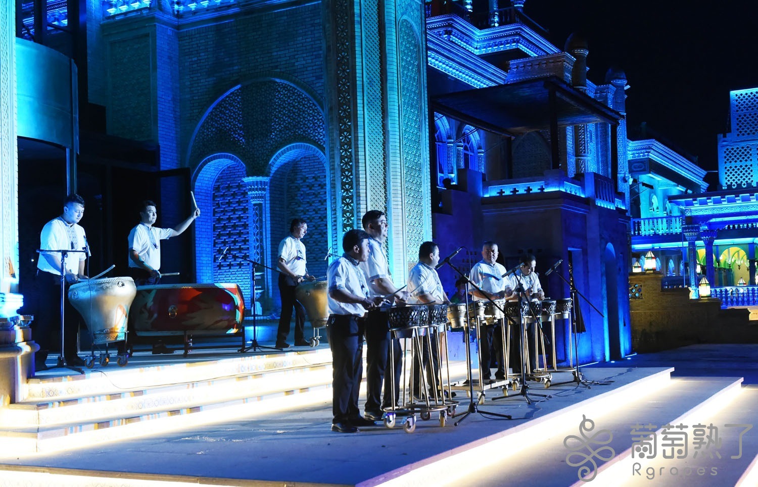 打擊樂《高昌鼓韻》。5月28日晚,高昌區麥西來甫風情莊園沉浸式演藝精彩上演,吸引了眾多游客和市民駐足觀看。葡萄熟了/吐魯番市融媒體中心記者 劉健 攝