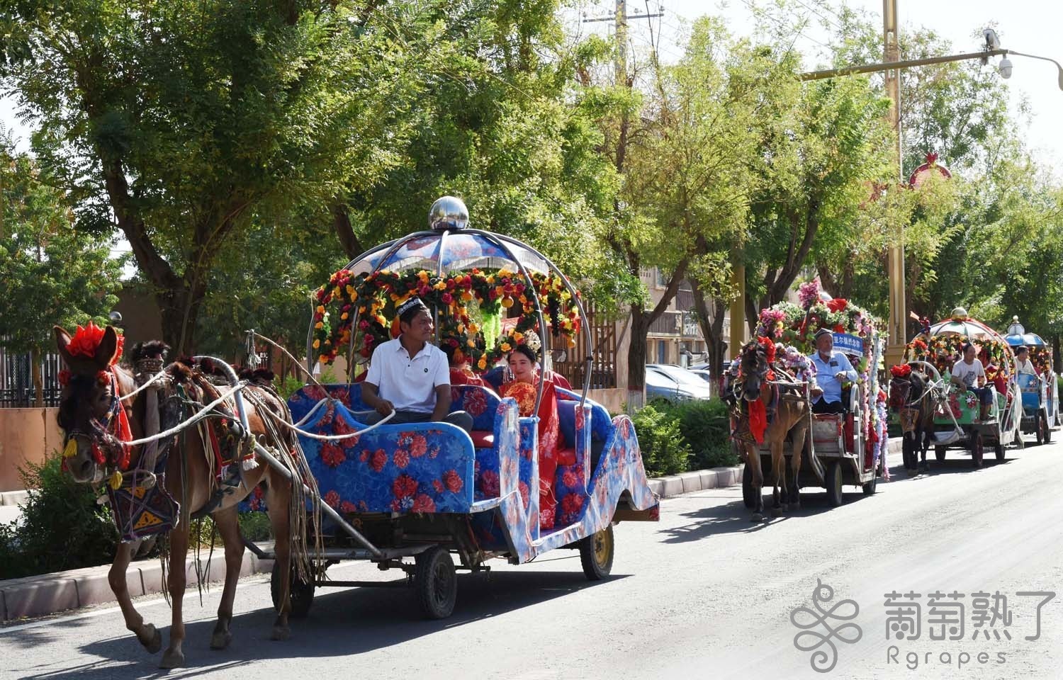 8月10日,乘坐馬車巡游的一對新人。葡萄熟了/吐魯番市融媒體中心記者 劉健 攝